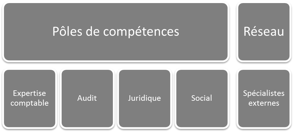 Le cabinet compte 1 équipe Audit, 8 équipes dédiées à l'expertise comptable et au conseil, 1 équipe sociale, 1 équipe de juristes, organisé autour de 4 domaines de compétences.